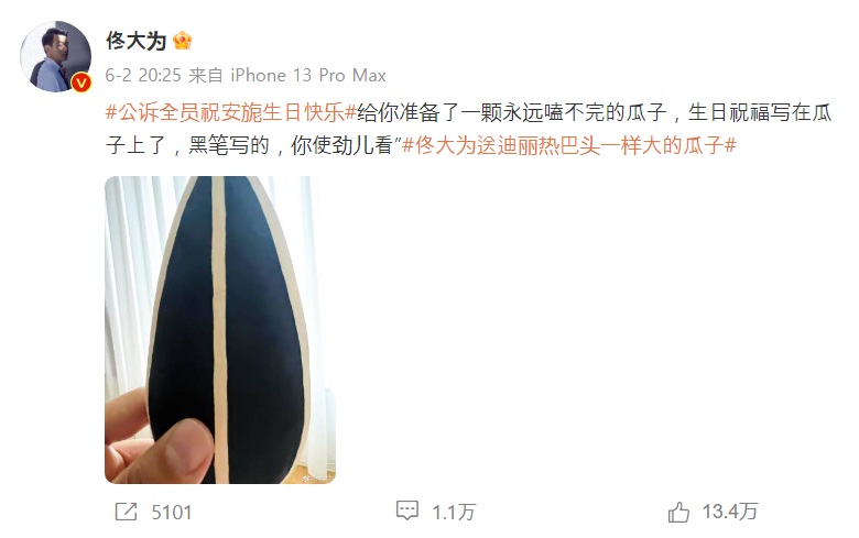 통따웨이(佟大为 동대위)는 디리러바의 머리만한 커다란 해바라기씨를 보내며, "너를 위해 영원히 다 까먹을 수 없는 해바라기씨를 준비했어, 생일 축복은 해바라기씨에 썼어, 검은 펜으로 썼으니 뚫어지게 봐야 할거야!"라며 생일축하를 했다.