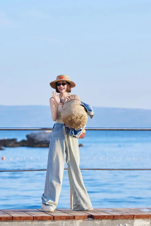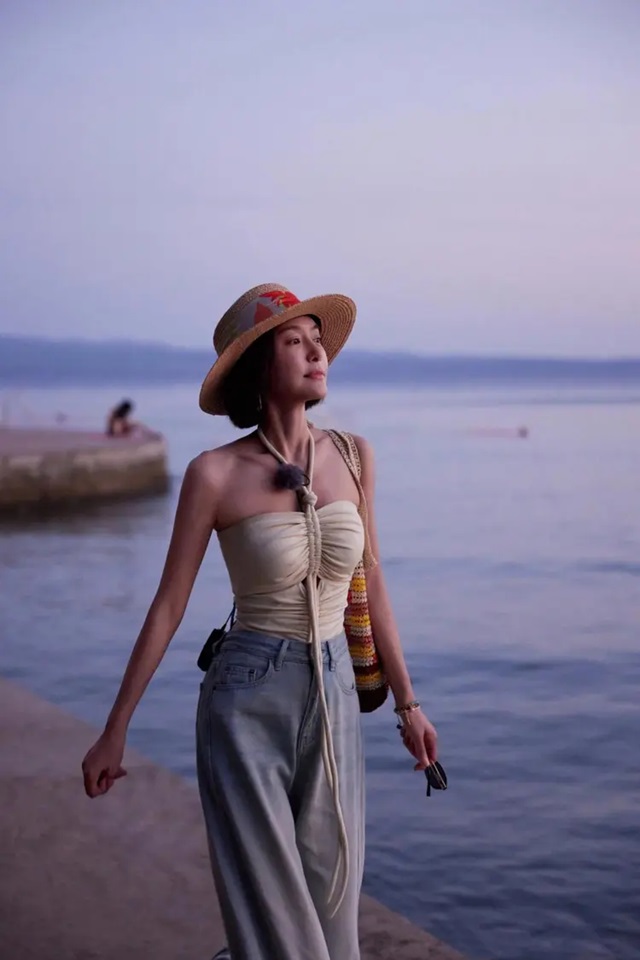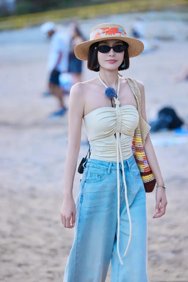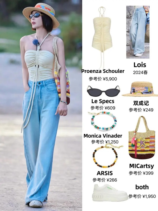 상체의 홀터넥 스트랩에 친란은 심플한 아이스 진바지를 선택해 전체적인 스타일링에서 청량감을 유지하고 있을 뿐만 아니라, 편안함과 드롭감을 더해주고 있다. 이러한 "위는 짧고 아래는 긴" 코디는 스타일리시하고 우아할 뿐만 아니라, 몸매 비율까지 효과적으로 보정해 주고 있어 친란을 더욱 늘씬하고 우아하게 보여지게 해주고 있다.